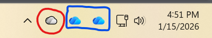 Each of the above One Drive icons represents a One Drive account. On most PCs, you will only have a single "white icon" One Drive as denoted by the red circle in the image above. This is your personal One Drive account that comes with your Outlook.com or Xbox account.