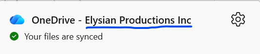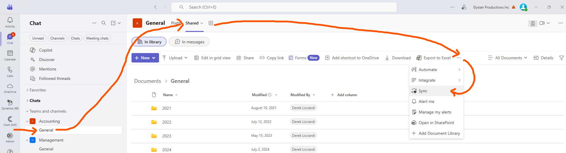 The three "blue arrows" pointing to the "Elysian Productions Inc" icon at the bottom are synchronized Team's document libraries. These are managed by your company and membership is typically added by your manager or IT administrators.