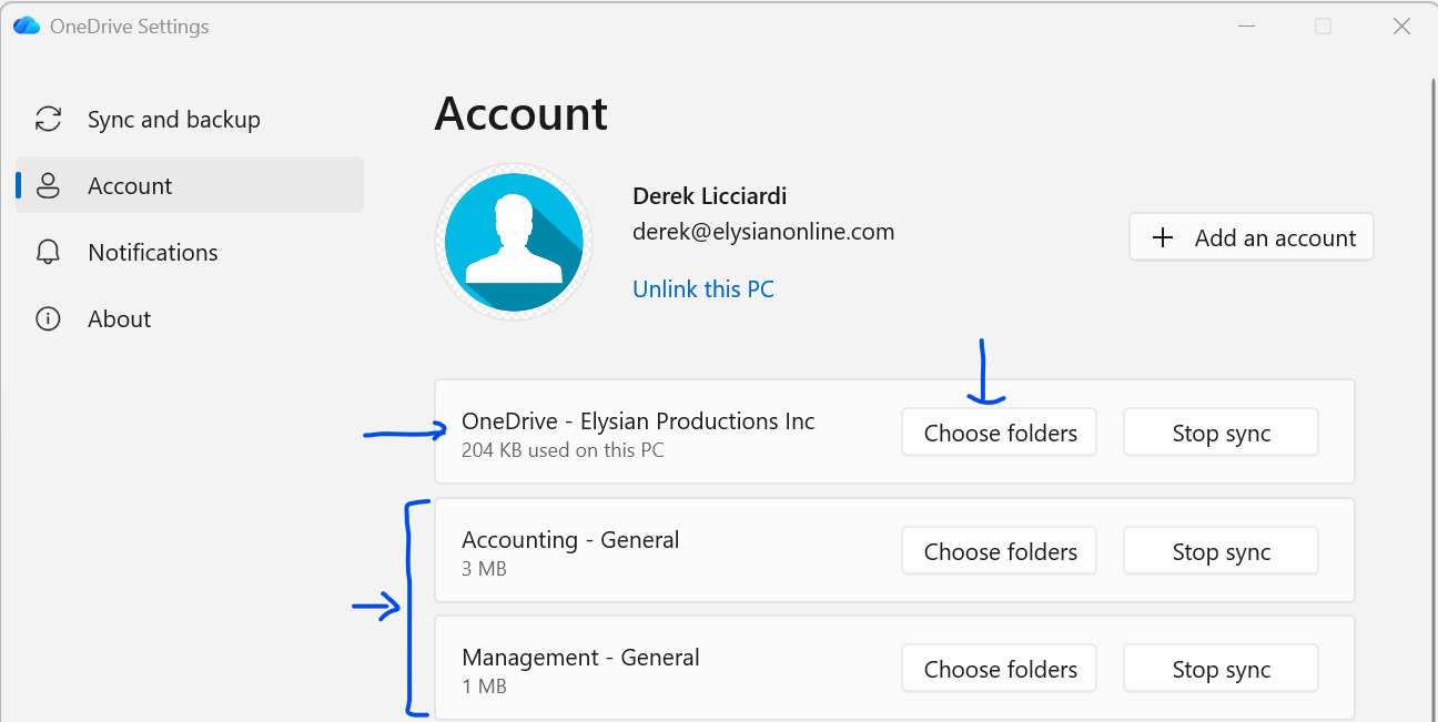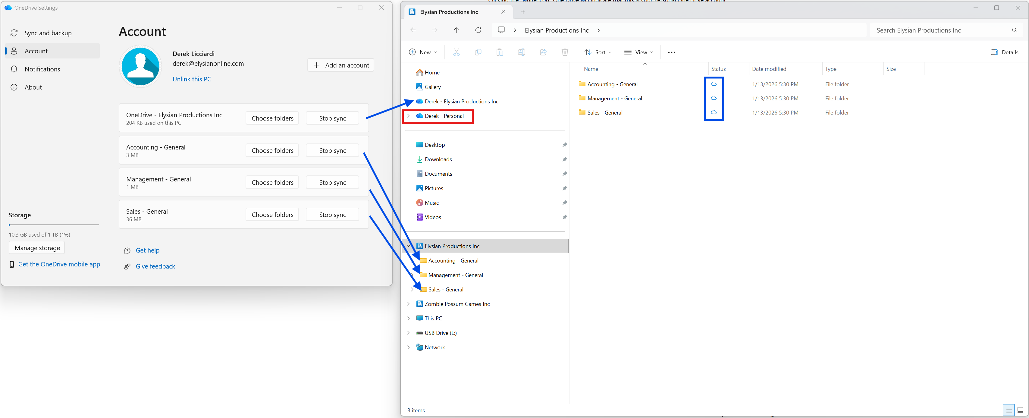 One of the advantages of One Drive managing all of this is that you can "sync" the contents of these folders to your Windows Explorer application. We explain everything about accounts above because where the files are synchronized depends on which account is synchronized.