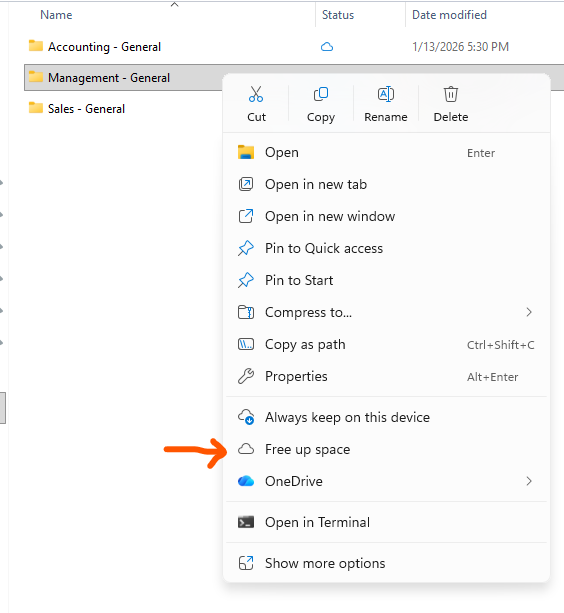 If you are running out of disk space on your machine, open Windows Explorer and right click any folder with a One Drive icon then choose "Free Up Space". This will remove the file from your local disk while keeping it online. The next time you access the file, it will be downloaded again.