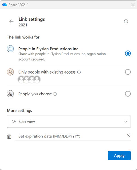 - The first item in the list is your "Employee" One Drive. This is a company managed personal storage space that only you can see. Files from this set of folders can be shared with other members in and outside of your organization if your administrators allow sharing which is on by default. Who has access to the files in this folder list is determined by the employee and managed by the employee.
